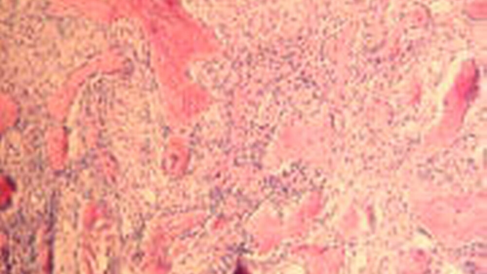 Die histopathologische Untersuchung , Dr. Frauke Bataille, Institut für Pathologie der Universität Regensburg, bestätigte die auswärts gestellte Diagnose eines narbig umgebenden ossifizierenden Fibroms, welches nun vollständig entfernt werden konnte (Abbildungen 4 und 5).