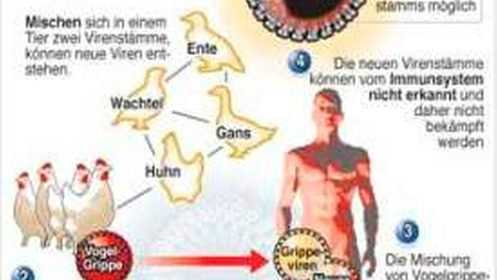 Eine Übertragung von Mensch zu Mensch ist bislang offenbar nicht möglich. Sie würde eine Mutation des Virus voraussetzen. Diese aber ist nicht unwahrscheinlich. Sie kann sich praktisch jederzeit vollziehen, wenn H5N1 auf für den Menschen pathogene Influenzaviren trifft und Teile des Genoms austauscht. Dann kann, so fürchten Seuchenexperten, ein äußerst aggressives Influenzavirus entstehen, das ähnlich gefährlich ist wie H5N1 und sich ebenso leicht von Mensch zu Mensch übertragen lässt wie die bekannten Grippeviren. Eine weltweite Pandemie mit bis zu 150 Millionen Toten könnte dann die Folge sein, eine Gefahr, die den Experten bereits lange bewusst ist und dazu geführt hat, dass in vielen Nationen bereits seit längerem fertig ausgearbeitete Katastrophenpläne für den Fall der Fälle in den Schubladen liegen.