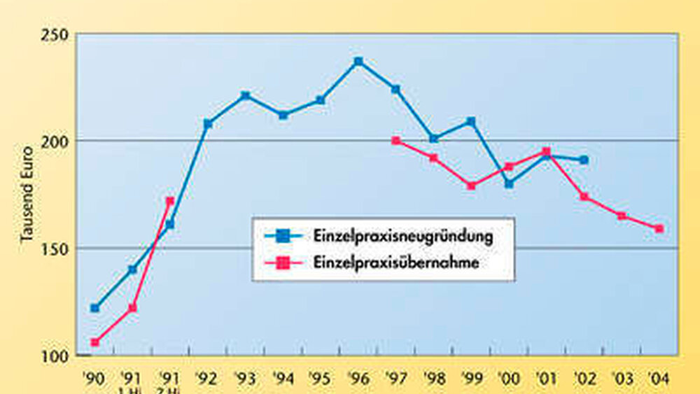 Als sich jedoch abzeichnete, dass die Wohlstandsentwicklung in den neuen Bundesländern dauerhaft hinter dem Niveau in den alten Bundesländern zurückbleiben würde, mussten die Zahnärzte ihre Umsatzerwartungen entsprechend reduzieren. Statistisch ist dieser Effekt anhand des rückläufigen Finanzierungsvolumens für beide Niederlassungsformen spätestens seit dem Jahre 1997 ablesbar (Abbildung 4).