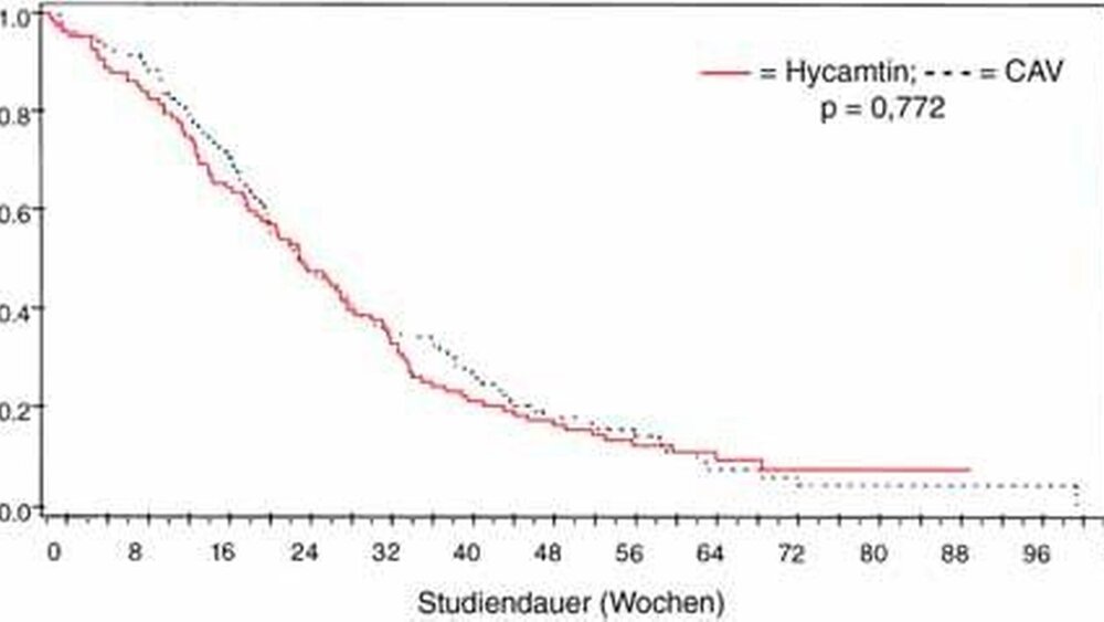 Bei etwa gleichen Nebenwirkungen auf das Blutbild wurden nur unter Topotecan die am meisten belastenden Symptome wie Atemnot, körperliche Schwäche, Beeinträchtigung der täglichen Aktivitäten, Abmagerung und Heiserkeit deutlich verringert, so dass die Patienten die ihnen noch verbleibende Lebenszeit besser nutzen konnten. Inzwischen sind durch eine Reduktion der Einstiegsdosis von Topotecan auf 1,25 mg/m2/d i.v. während der ersten fünf Tage bei gleicher Symptomkontrolle auch die hämatologischen Nebenwirkungen im Vergleich zu CAV deutlich verringert worden.