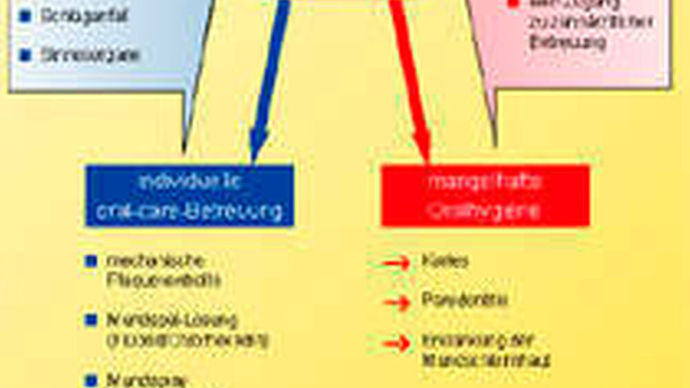 Hingegen sind bei einer anderen zahnmedizinischen Risikogruppe, nämlich der der Behinderten und betreuten Alten, noch erhebliche Anstrengungen erforderlich, um auch hier mit bedarfsgerechten Programmen eine Steigerung der Lebensqualität durch Reduzierung der durch Zahn-, Mund- und Kiefererkrankungen bedingten Morbiditäts- und Mortalitätsrate zu erreichen.