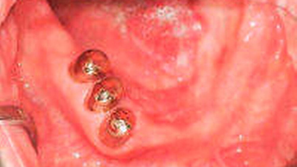 Seit 1996 wurden jährliche CT-Kontrollen vorgenommen. Dabei konnte in keinem Fall ein Anhalt für ein Rezidiv – weder des branchiogenen Karzinoms noch des Plattenepithelkarzinoms – gefunden werden. Die Abbildung 3 zeigt den Patienten zehn Jahre tumorfrei, Abbildung 4 demonstriert die intraorale Situation des mittlerweile durch Teleskopprothese rehabilitierten Patienten.