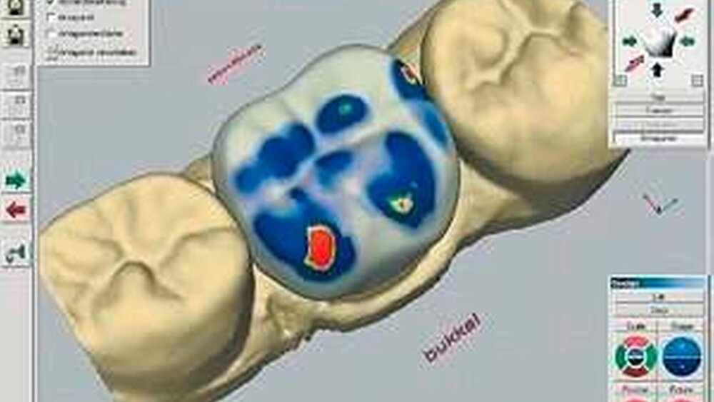 Dr. Klaus Wiedhahn, Buchholz, navigierte ein chairsidearbeitendes CAD/CAM-System zur Fertigung von vollkeramischen Restaurationen (Cerec). Als Meilenstein in der Computertechnik bewährte sich die okklusaladaptive, gerüstfreie Vollkrone, ausgeschliffen aus Feldspat- oder Leuzitkeramik. Die Software übernimmt das Kauflächenreplikat vom Antagonisten, vom Quetschbiss oder wählt eine Krone aus der Zahndatenbank aus. Die Höcker werden einzeln bewegt, um weitere mögliche Kontaktpunkte zu erzeugen und einzustellen (siehe Abbildung). Diese biomimetische Anpassung ist erheblich schneller als das Aufwachsen einer Kaufläche.