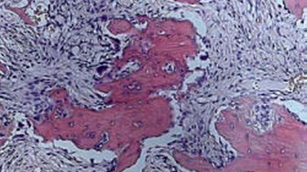 Anamnestisch war bereits vor sechs Jahren ein knöcherner Befund in derselben Region entfernt worden, dessen feingewebliche Untersuchung damals ein enossales spongiöses Osteom (Osteoma spongiosum) beschrieb.