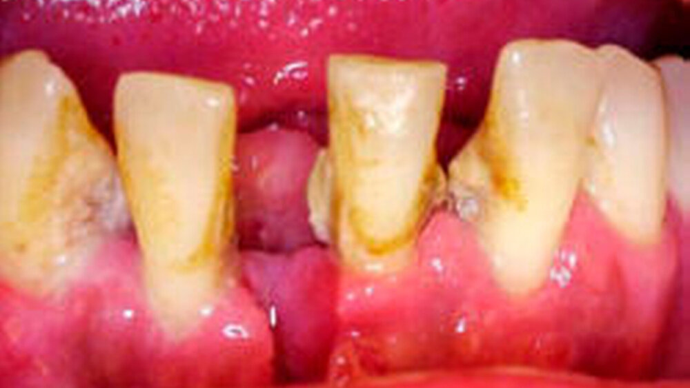 Erst bei der 01 fiel unter der Zahnsteinmauer in der Unterkieferfront das Zwirnfadengebilde auf. Bei der normalen Kommunikation war es nicht zu sehen gewesen. Da es die Patientin nicht störte, hatte sie auch initial nicht darauf hingewiesen.