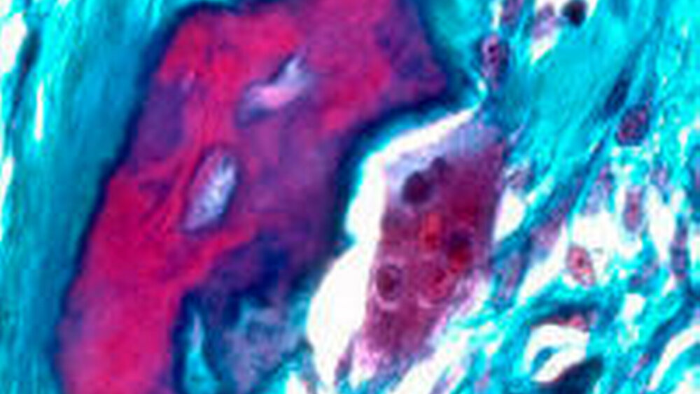 Bei heterotopen oder metaplastischen Ossifikationen handelt es sich um Knochenkerne, die sich morphologisch nicht von regulärem Knochengewebe unterscheiden. Es finden sich die typischen zellulären Bestandteile des Knochens und auch die für die Remodellierung und Resorption verantwortlichen Osteoklasten (Abbildungen 4). Solche mit einem regulären Knochenstoffwechsel ausgestatteten Gewebe sind gegen dystrophe Verkalkungen abzugrenzen, die auf einem passiven, vom pH-Wert abhängigen Ausfällungsprozess von Calciumcarbonat und Calciumphosphat beruhen und daher typischerweise azelluläre Hartgewebsanteile darstellen. Während teilweise distinkte Zellen aus dem Periost beziehungsweise aus dem Periodontalligament für das Auftreten der fokalen Verknöcherungen verantwortlich gemacht werden, gehen andere Autoren von eher unspezifischen Reizen im Sinne von Ischämien, Einblutungen oder lokalen Infektionen des Gewebes aus. Für die zahnärztliche Praxis soll dieser Fall auf die unterschiedliche Verwendung des Begriffes der Epulis hinweisen und daran erinnern, dass sich hinter diesem historischen Begriff teilweise ganz unterschiedliche Krankheitsentitäten verbergen.