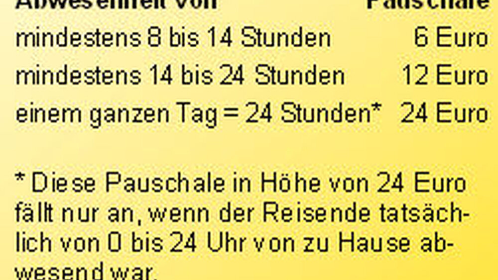 Da der Verpflegungsmehraufwand für den Einzelfall sehr aufwendig zu ermitteln wäre, gibt das Finanzamt je nach Dauer der Abwesenheit gestaffelte Pauschalbeträge vor; bei einer Abwesenheit von weniger als acht Stunden am Tag geht der Fiskus davon aus, dass kein Mehraufwand angefallen ist. Auch wenn höhere Kosten entstehen, dürfen nur die Pauschalen angesetzt werden.