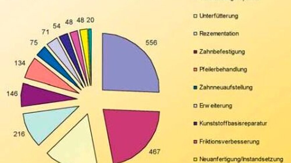 Die Wiederherstellungsmaßnahmen wurden in folgender, numerisch absteigender Reihenfolge durchgeführt: Entfernung von Druckstellen (26 Prozent), Instandsetzung von Verblendungen (22 Prozent), Unterfütterungen (16 Prozent), Rezementierungen gelöster Primärkronen (10 Prozent), Wiederbefestigung gelöster Prothesenzähne (7 Prozent) und Behandlung von Pfeilerzähnen (6 Prozent). Neuaufstellung der Prothesenzähne, Erweiterung von Prothesen, Reparatur der Kunststoffbasis der Prothesen, Verbesserung der Friktion zwischen Primärund Sekundärteleskop, Neuanfertigung oder Instandsetzung von Primärkronen und Gerüsten sowie Reparaturen an der Metallbasis nahmen jeweils nicht mehr als 3 Prozent aller Maßnahmen ein.