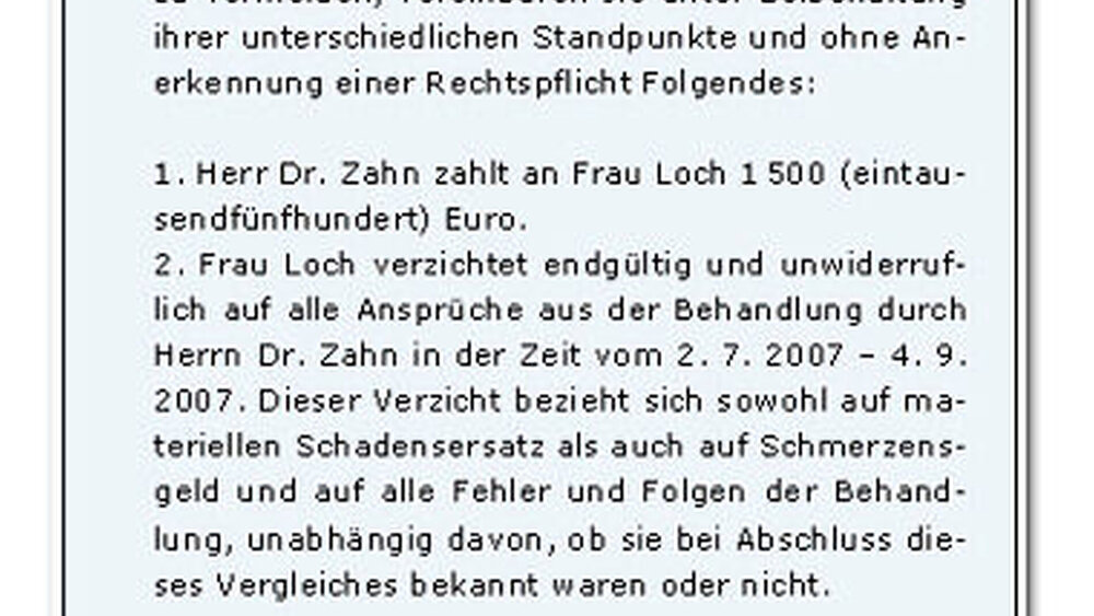 Viele Zahnärzte zögern mit einem solchen Vergleich, da sie befürchten, auf diese Weise einen Behandlungsfehler einzugestehen. Diese Sorge ist bei der gewählten Formulierung unbegründet. Selbst wenn dieser Text dem Patienten beziehungsweise seinem Rechtsanwalt vorgeschlagen wird, dieser aber ablehnt, ist nichts verloren.