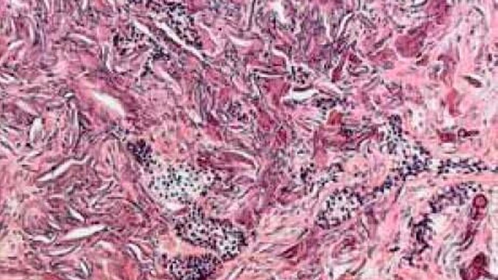 Die Entfernung des Gebildes erfolgte über einen transfazialen Zugang unter Anlage eines Knochendeckels. Abbildung 3 zeigt den Blick auf den von glatter Schleimhaut bedeckten Befund unmittelbar nach der Entnahme des Knochendeckels. Entsprechend der guten Begrenzung ließ sich das Gebilde ohne großen Aufwand auslösen und in toto entnehmen. Der Zahn 18 war von einer Gewebemanschette umgeben, die klinisch sehr fest und im Anschnitt als eine von Hartgewebsanteilen durchsetzte fibröse Matrix erschien (Abbildung 4). Histologisch zeigte sich die typische Morphologie eines komplexen Odontoms, in dem sowohl Anteile von tubulärem Dentin als auch Aggregate von Schmelz und Schmelzmatrix und auch Pulpengewebe vorkamen (Abbildung 5). Typische kleine zahnähnliche Gebilde, wie beim zusammengesetzten Odontom, fanden sich nicht. Die histologischen Präparate wurde freundlicherweise durch Dr. Hansen (Institut für Pathologie, Direktor: Prof. Dr. J.C. Kirkpatrick) zur Verfügung gestellt.