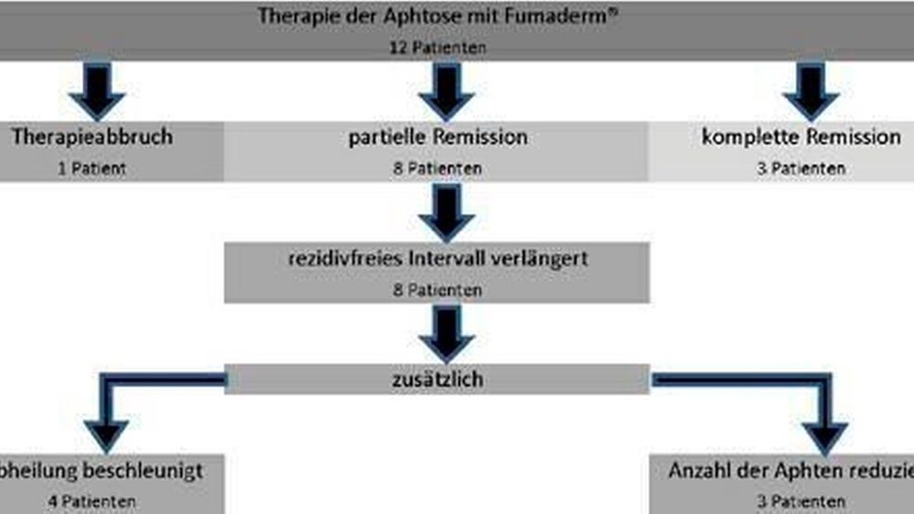 Anhand von zwölf Patienten mit unterschiedlichen Aphthentypen sollen die Therapieerfolge aufgezeigt werden (Tabelle 6). Bei drei Patientinnen trat eine komplette Remission auf, in acht Fällen kam es zur partiellen Remission in Form einer Verlängerung des rezidivfreien Intervalls, wobei zusätzlich von vier Patienten eine beschleunigte Abheilung und von drei Patienten eine Reduktion der Aphthenzahl angegeben wurde. In einem Fall musste die Fumaderm®-Therapie abgebrochen werden, weil gastrointestinale Beschwerden aufgetreten waren.