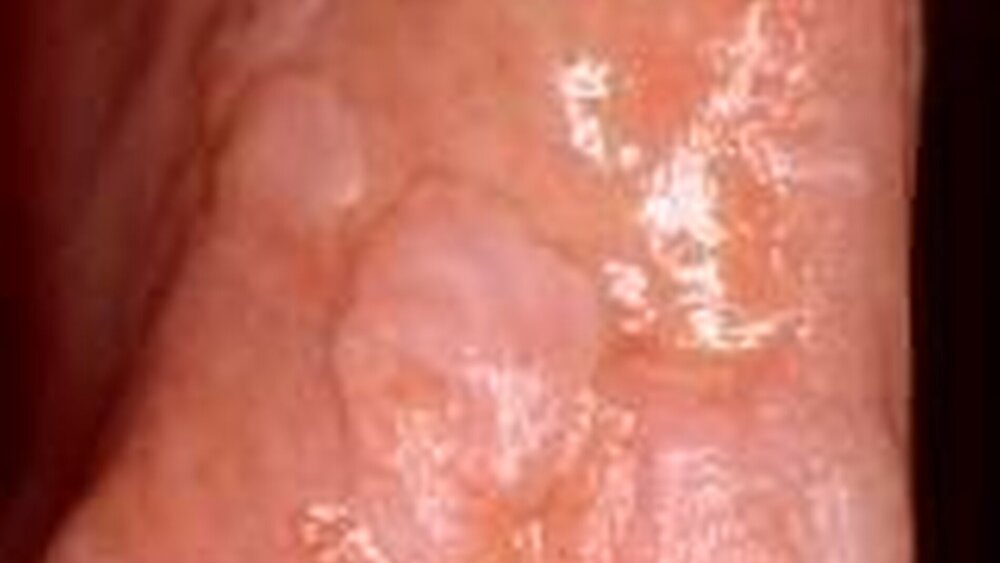 Einige der 118 bisher bekannten HPV konnten in einer Anzahl benigner oraler Läsionen nachgewiesen werden. Hierzu zählen das Plattenepithelpapillom/-kondylom (Abbildungen 5a und b), die Verruca vulgaris (Abbildung 6), die fokale epitheliale Hyperplasie (Abbildung 7), die fibröse Hyperplasie, der Lichen planus und die Leukoplakie. Während Condylome mit HPV 6 und 11 assoziiert sind, werden Verrucae durch Typ 2, 4 und 57 und die fokale epitheliale Hyperplasie durch HPV 13 und 32 hervorgerufen. Letztere wird häufig bei Eskimos und bei HIV-positiven Patienten beobachtet.
