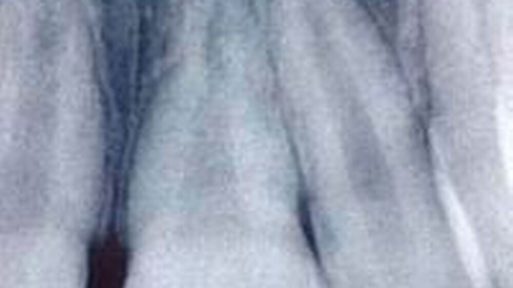 Die klinische Untersuchung ergab bis auf eine erhöhte Beweglichkeit und Perkussionsempfindlichkeit des Zahnes 21 keine pathologischen Befunde. Der füllungs- und kariesfreie Zahn reagierte auf den Sensibilitätstest nicht (Kältetest). Die zirkulär erhobenen Sulkussondierungstiefen lagen bei zwei Millimetern. Die Nachbarzähne 11 und 22 waren unauffällig. Im Röntgenzahnfilm (Abbildung 1) lässt sich eine Querfraktur in der Wurzelmitte des Zahnes 21 erkennen. Die apikalen Verhältnisse sind unauffällig.