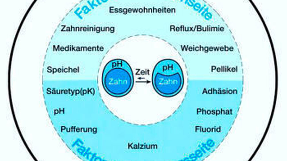 Ein weiterer sehr wichtiger Faktor ist der Speichel. Einige schützende Eigenschaften des Speichels bei einem Säureangriff sind: Säureverdünnung, Säureabbau, Säureneutralisation, Verminderung der Schmelzauflösung durch das Vorhandensein von Kalzium- und Phosphationen im Speichel, Remineralisation und Pellikelbildung [Zero & Lussi, 2000]. Mehrere Studien haben die Wichtigkeit von Speichel für den Abbau und die Neutralisation von Säuren sowie Remineralisation auf der Zahnoberfläche bestätigt [Järvinen et al., 1991; Meurman et al., 1994; Lussi & Schaffner, 2000; Eisenburger et al., 2001; Feagin et al., 1969; Gedalia et al., 1991; Zero et al., 1994].