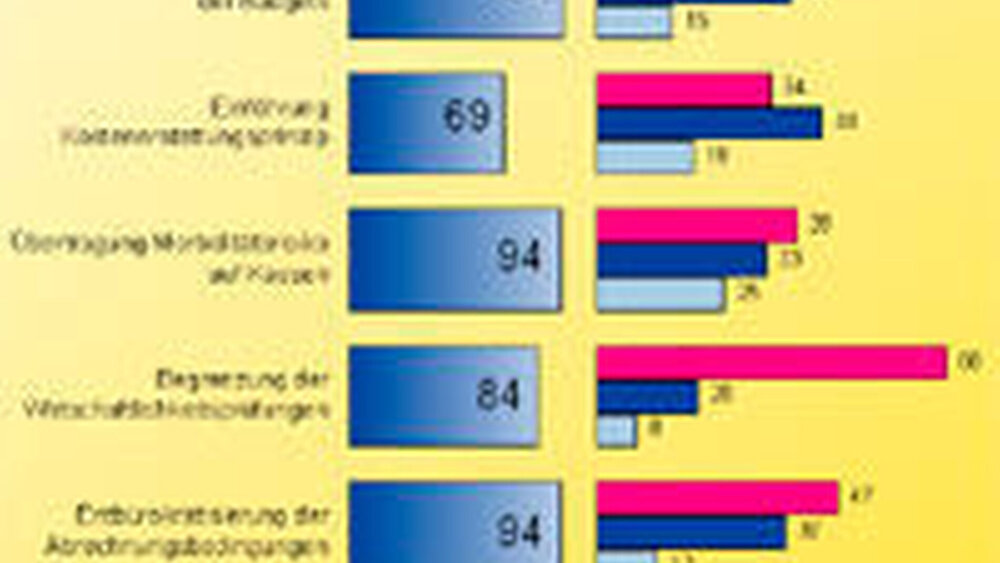 Vorrangige Forderung von Basis (95 Prozent) und Körperschaften bleibt die Abschaffung der Budgets. Hierbei trauten die Befragten der KBV mehr Schlagkraft zu als irgend einer anderen Interessenvertretung. Angehen wolle die KBV diesen Punkt, denn er ist Quell ständigen Ärgers, da er nur eine „Mangelverwaltung“ zulässt, meinte Köhler. Entsprechend sähen 22 Prozent die eigene Arztgruppe benachteiligt. Fast ebenso viele, 21 Prozent, sehen ihre Interessen gegenüber den Kassen schlecht vertreten.