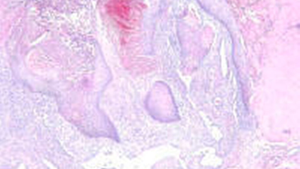 Der Tumor wurde ohne Sicherheitsabstand spindelförmig exzidiert (Abbildung 1a). Die histologischen Präparate zeigten ein oberflächlich gelegenes Schleimhautulkus mit granulozytärer Demarkation und Einblutungen. An den Rändern imponierte eine pseudoepitheliomatöse Hyperplasie mit ausgezogenen Epithelzapfen. Zur Tiefe hin fanden sich eine chronisch granulierende Entzündung sowie miteinander kommunizierende und endothelial ausgekleidete Gefäßspalten (Abbildungen 2a, 2b). Die histopathologische Begutachtung durch Dr. Stephan Schwarz, Institut für Pathologie der Universität Regensburg, diagnostizierte eine vollständig resezierte venöse Malformation.