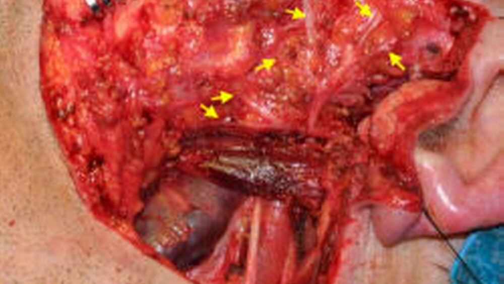 Die Behandlung von Parotismetastasen lässt sich kaum standardisieren und ist häufig eine Individualentscheidung. Da es sich zumeist um Patienten im weit fortgeschrittenen Lebensalter mit hohen altersbezogenen Behandlungsrisiken handelt (im eigenen Patientengut handelte es sich praktisch durchgehend um Patienten in der achten und neunten Lebensdekade) und außerdem oft weitere regionale oder systemische Metastasierungen bereits vorhanden sind, sind die Aussichten radikal-chirurgischer Therapieansätze häufig sehr begrenzt. Aus diesen Gründen wurde im vorliegenden Fall ein eher konservatives Vorgehen unter Erhaltung der Fazialisfunktion gewählt (Abbildung 4).