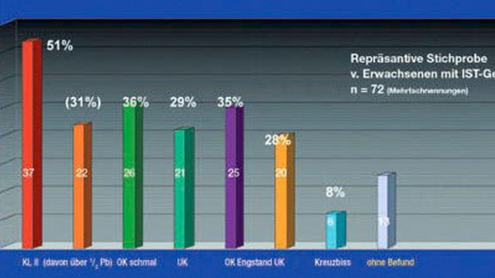 82 Prozent der Kiefermodellpaare wiesen Kieferanomalien auf, nur bei 18 Prozent wurden keine kieferorthopädischen Befunde festgestellt. Die Hälfte aller Kiefermodellpaare hatten eine Rücklage des Unterkiefers (Angle-Klasse II) und bei 36 Prozent der Fälle waren die Kieferbögen zu schmal, wiesen Kreuzbisse auf oder hatten eng stehende Frontzähne [Hinz et al., 2007].