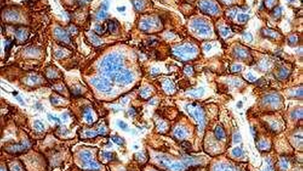 In Anbetracht der geringen Belastbarkeit des Patienten (Immunsuppression, Hämochromatose, Spinalkanalstenose und mehr) entschlossen wir uns zu einer Diagnosesicherung über die vergleichsweise risikoarme Entnahme eines regionären Lymphknotens. Intraoperativ stellte sich erwartungsgemäß ein ausgedehntes Lymphknotenkonglomerat unter dem M. sternocleidomastoideus dar, das in toto umfahren und entnommen wurde (Abbildungen 5 a und b). Im Anschnitt des Lymphknotens (Abbildung 6) stellte sich eine weitgehend homogene Oberfläche dar. Histologisch zeigte sich eine vollständige Auflösung der lymphknotentypischen Follikelstruktur. Das histomorphologische Bild (Abbildung 7) war geprägt durch Infiltrate einer pleomorphen, inhomogenen Zellpopulation, teilweise mit gelappten oder irregulär gefalteten Kernen und prominenter Chromatinstruktur. In der Immuntypisierung stellten sich diese Zellen positiv für den B-Zell-Marker CD20 dar. Damit ergab sich die abschließende Diagnose eines hoch malignen anaplastischen B-Zell- Lymphoms. Zur weiteren Therapie wurde der Patient daher der hämatologisch-onkologischen Klinik zugeleitet.