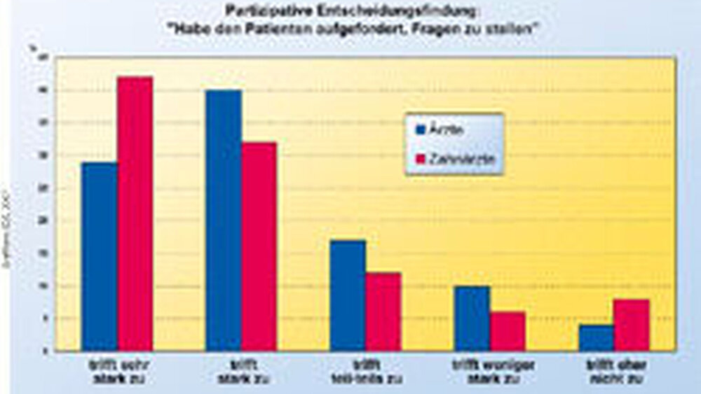 Ein Vergleich der zwei Studien dürfte schon allein deshalb von hohem Interesse sein, weil beide auf dem gleichen Messkonzept basieren. Zur strukturierten Erfassung der partizipativen Entscheidungsfindung auf der Mikroebene der Arzt-Patienten-Interaktion wurde nämlich in beiden Studien die gleiche Itembatterie verwendet. Mit einer aus sechs Antwortkategorien bestehenden Itembatterie sollten die befragten Ärzte und Zahnärzte den Ablauf des durchgeführten Beratungsprozesses aus ihrer Sicht dokumentieren und ihr eigenes Verhalten im Gespräch mit dem Patienten beurteilen und entsprechend auf einer Fünferskala einordnen. Die verwendete Itembatterie ist in der wissenschaftlichen Literatur gut verankert und wird in dieser Form beispielsweise seit längerem in dem Projekt „Gesundheitsmonitor“ der Bertelsmann Stiftung verwendet. Aus dem oben beschriebenen Fragenkatalog werden nachfolgend die Antwortmuster zu zwei Fragen wiedergegeben, die Einzelaspekte des ärztlichen beziehungsweise zahnärztlichen Kommunikationsverhaltens betreffen. Hierbei handelt es sich zum einen um die Frage, in welchem Umfang die Vorstellungen des Patienten einbezogen wurden, und zum zweiten um die Frage, ob der Arzt beziehungsweise Zahnarzt den Patienten explizit aufgefordert hat, Fragen zu stellen.