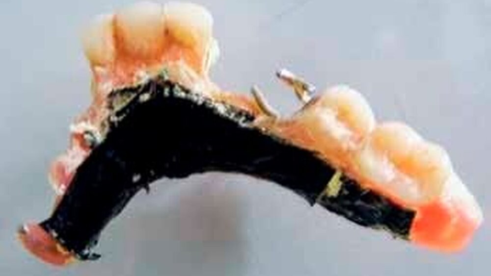 Der relativ junge Mann ist Handwerker und kam mit einem „Provosorium“, einer Teilprothese , die er mit Isolierband „fachgerecht“ repariert hatte, da sie ihm zerbrochen war. Diese Teilprothese ist im Laufe der Jahre zur Stabilität sukzessive mit Zahnstein unterfüttert worden. Sie hat in diesem Zustand schon zwei, drei Jahre ihren Dienst getan ... Der Patient war zufrieden.