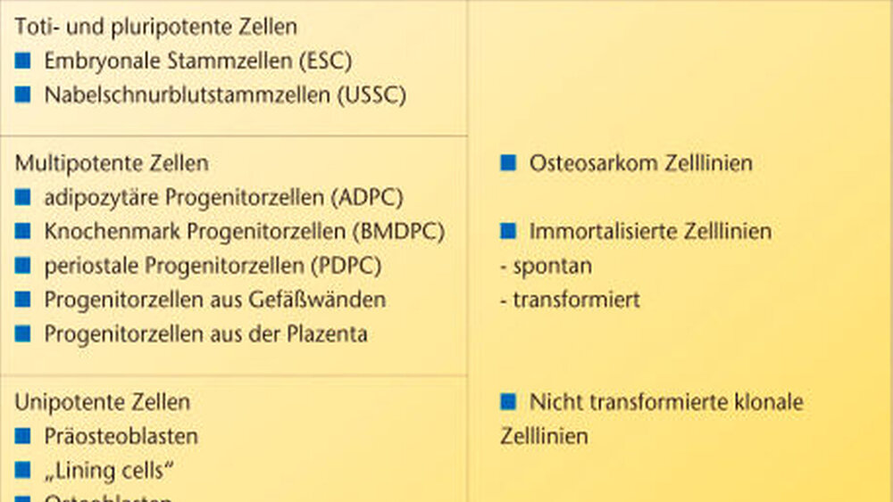 Zellarten, die beim „Tissue Engineering“ Verwendung finden, können autologen, allogenen oder xenogenen Ursprungs sein. Diese Kategorien können noch entsprechend ihrer Differenzierungskapazität in ausdifferenzierte (Osteoblasten), multipotente, pluripotente und totipotente Zelllinien unterteilt werden. Im Gegensatz zu totipotenten Zellen, die einen kompletten Organismus generieren können, können sich pluripotente Zelllinien in Zellen aller drei Keimblätter differenzieren. Ihnen fehlt aber die Kompetenz, einen komplexen Gesamtorganismus zu bilden.