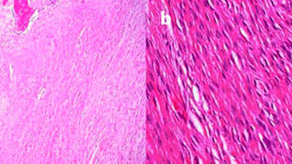 Histopathologisch findet sich – wie in Abbildung 6 zu erkennen – eine spindelzellige, fibroblastäre Proliferation mit unterschiedlich ausgeprägter Kollagenfaserbildung sowie variabler Kernatypie. Charakteristisch ist eine Anordnung der Zellen in sich durchflechtenden Zellzügen, so dass das Bild einer sogenannten Heringsschwarmformation resultiert (Hering-bone pattern). In Abhängigkeit von der Tumordifferenzierung, der Mitoserate und dem Auftreten von Tumornekrosen werden niedrig bis hochmaligne Fibrosarkome unterschieden (Grad 1- 3) [Rao et al., 1989; Fletcher et al., 2002].
