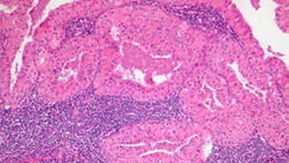 Therapeutisch erfolgte die operative Entfernung im Sinne einer bilateralen konservativen Parotidektomie. Entsprechend der Bildgebungsbefunde erwiesen sich die Tumoren als gut begrenzt mit straffer Kapsel (Abbildung 4). Im Anschnitt der Tumoren imponierte eine grau-braune fast granulär erscheinende Oberfläche mit kleinherdigen zystischen Anteilen (Abbildung 5). Histologisch zeigte sich das typische Bild eines Zystadenolymphoms mit einem zweireihigen onkozytären Epithel. Als weiteres charakteristisches morphologisches Merkmal finden sich ausgeprägte Zonen lymphatischen Gewebes (Abbildung 6).