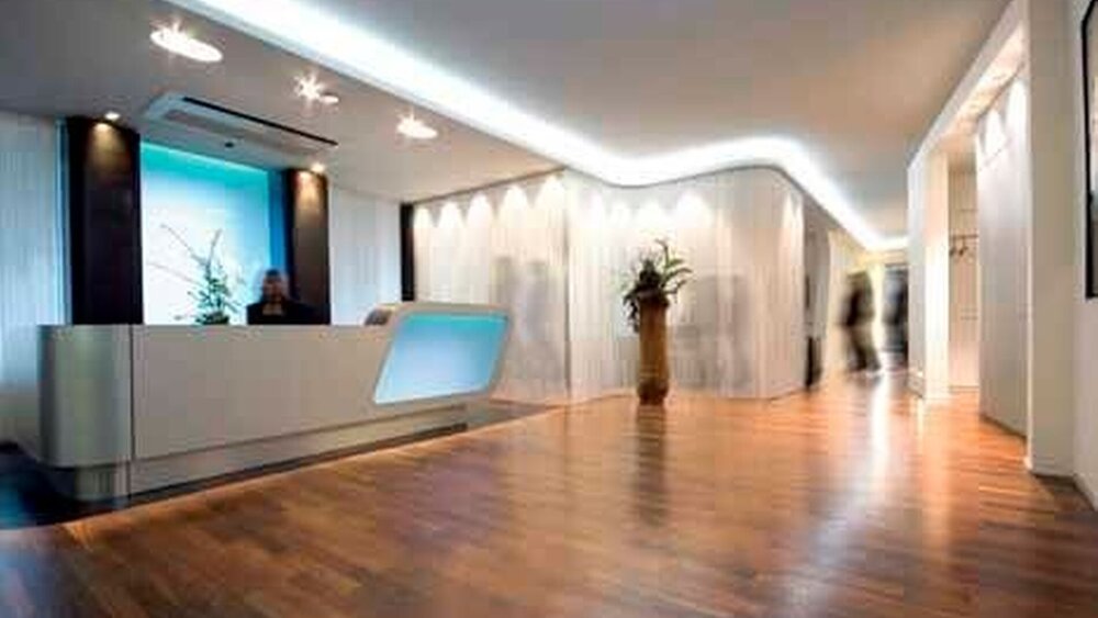 Nach dem Umbau erinnert nichts mehr an die ehemalige Nutzung. Statt enger Bürozellen wurde eine offene und helle Raumsituation mit fließenden Übergängen zwischen den unterschiedlichen Bereichen Empfang, Warten und Behandlung geschaffen. „Aufgrund der ästhetischen Ausrichtung legen die Patienten der Praxis großen Wert auf eine besondere Gestaltung, in der sie sich wohlfühlen“, erklärt Interior Designer Hubert Günther. „Um diese hohe Erwartung zu erfüllen, haben wir bewusst eine moderne und eindeutige Architektursprache mit hochwertigen Materialien und harmonischen Proportionen verfolgt.“ Markante Blickpunkte sind dabei die dunklen Fußböden aus geräuchertem Eichenparkett, die schon beim Betreten der Praxis eine großzügige und edle Atmosphäre schaffen, die transparenten Fadenvorhänge zwischen Empfang und Wartebereich sowie die geschwungene, hinterleuchtete Empfangstheke aus Aluminium, die mit ihrer veränderbaren Lichtsteuerung unterschiedliche Raumstimmungen erzeugt. Ein weiteres wichtiges Gestaltungselement ist die intelligente Lichtführung, die die Patienten vom Empfang bis in die jeweiligen Behandlungsbereiche leitet.