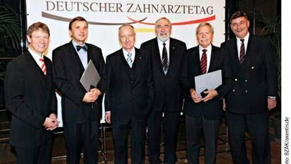 „Besser Lob verdienen, als Lob erhalten, Aber das eine schließt ja das andere nicht aus. Zumal wir das Loben an dieser Stelle auch noch vergolden“ – mit diesen launigen Worten verlieh BZÄK-Präsident Dr. Dr. Jürgen Weitkamp die Ehrennadel der Bundeszahnärztekammer in Gold für ihr langes und verdienstvolles Engagement für die Zahnärzteschaft an Sanitätsrat Dr. Wolfgang Weis, Dr. Ulrich Oesingmann und Prof. Dr. Dr. h.c. Georg Meyer.