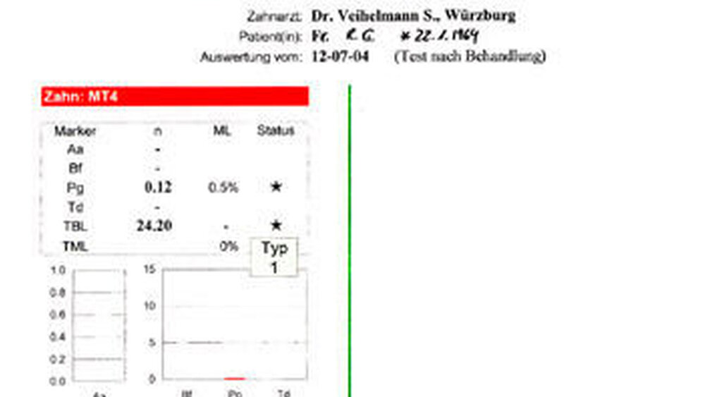 Die Auswertung der gepoolten Testproben erbringt den Nachweis aller durch den Test bestimmbaren parodontopathogenen Keime (Aggregatibacter actinomycetemcomitans, Tannerella forsythensis, Treponema denticola, Porphyromonas gingivalis). In der an Zahn 11 entnommenen Probe können die zuanalysierenden Markerkeime jedoch in nur sehr geringen Quantitäten nachgewiesen werden.