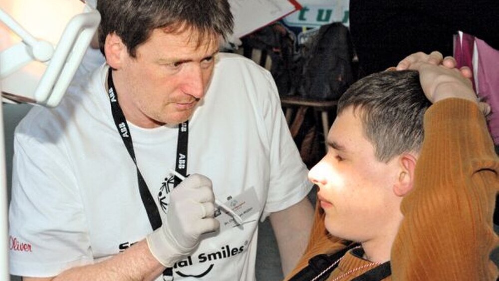LAGZ-Zahnärztinnen und Zahnärzte aus der Region mit ihren Helferinnen bildeten im halbtäglichen Turnus die Untersuchungsteams und hielten ihre Untersuchungsergebnisse (reiner Sichtbefund) in einem englischsprachigen und einem deutschen Screeningbogen fest – ersterer geht zur Auswertung in die USA, ein deutscher Bogen, der vom Clinical Director in Zusammenarbeit mit Prof. Dr. Andreas Schulte, Heidelberg, Prof. Dr. Peter Cichon, Witten-Herdecke, und Dr. Imke Kaschke, Berlin, erarbeitet worden war, wird nach Heidelberg zur Auswertung geschickt. Auch Hils war mit zwei Helferinnen aus seiner Praxis täglich in Inzell als Untersucher tätig und unterwies seine bayerischen Kollegen im Ablauf. Unterstützt wurde er dabei tatkräftig vom ehemaligen Berliner Kammerpräsidenten Dr. Christian Bolstorff und dessen Frau, die überzeugt vom Nutzen des Special-Smiles-Programms bereits zum wiederholten Mal bei den Special Olympics mitwirkten. Nach absolviertem Untersuchungs- und Putzparcours erhielt jeder Athlet eine Bestätigung über die durchgeführte Untersuchung – gegebenenfalls mit dem Hinweis auf einen festgestellten Behandlungsbedarf – und mit Tipps für gesunde Zähne. Mit einer Tüte voller Give-aways, gesponsert von den Firmen GABA und Wrigley Oral Healthcare Programs , und Infomaterial zogen dann die Athleten zufrieden weiter zu den benachbarten Untersuchungsstationen Opening Eyes, Healthy Hearing, Fit Feet oder Health Promotion.