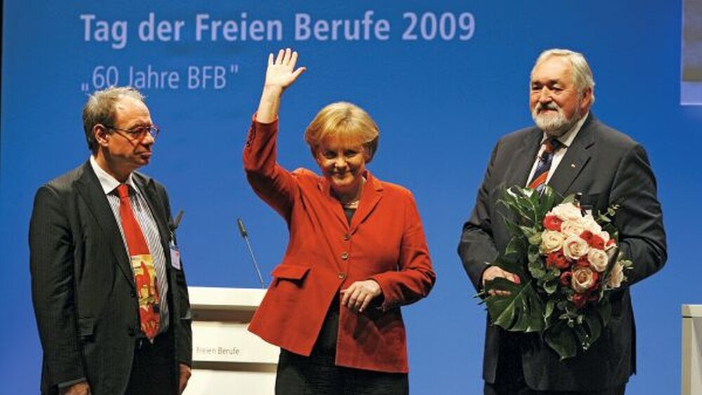 Der Andrang war groß, die politische Prominenz zeigte sich zahlreich auf dem Festempfang des Bundesverbandes der Freien Berufe anlässlich seines 60-jährigen Bestehens. Höhepunkt war die Ansprache von Bundeskanzlerin Merkel, die das Engagement und die Verdienste der Freien Berufe in der Gesellschaft unterstrich: „Ob Sie als Ärzte, Anwälte, Architekten, als Schauspieler, Ingenieure oder in einem der vielen anderen Freien Berufe arbeiten, tätig sind und mit den Menschen in unserem Land in Kontakt sind – Sie verkörpern einen wichtigen Teil des Geistes der Sozialen Marktwirtschaft. Sie tragen ganz wesentlich dazu bei, dass diese ein Erfolgsmodell ist. Deshalb möchte ich Ihnen nicht einfach nur zum Geburtstag gratulieren, sondern ich möchte Ihnen, die Sie für die eine Million Freiberufler und ihre fast drei Millionen Beschäftigten stellvertretend hier sind, auch ein herzliches Dankeschön für das sagen, was Sie für den Aufbau dieser Republik getan haben.“ Freie Berufe seien als Teil des Mittelstandes das Rückgrat unserer Volkswirtschaft, so die Kanzlerin weiter. Sie lobte die Freiberufler dafür, dass sie sich mit ihrem Leitbild ausdrücklich zu Werten bekennen. Ohne die gesellschaftliche Einbindung könne der Freiberufler seine Existenz in einer auf harten und kurzfristigen Wettbewerb ausgerichteten Welt nicht begründen.