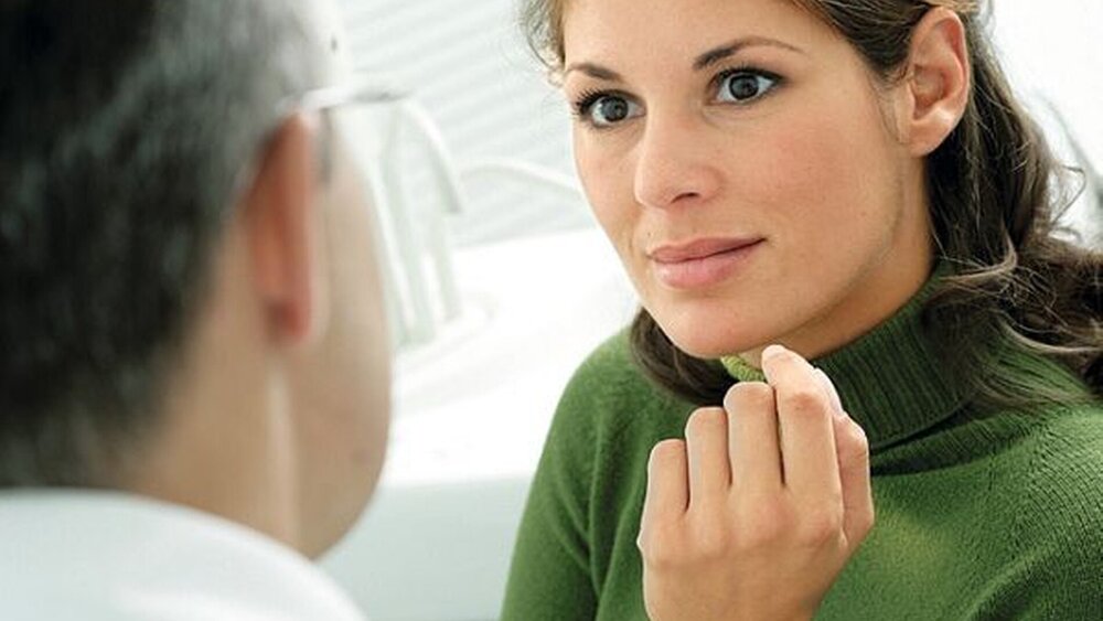 Der Behandler erklärt dem Patienten auf Augenhöhe den Befund und