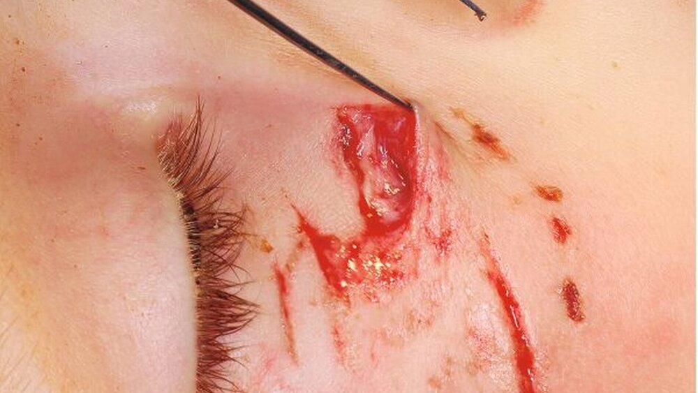 In unserer Klinik stellte sich ein Patient vor, der angab, von dem Hund einer ihm bekannten Person in das rechte Ohr gebissen worden zu sein. Außerdem habe er mehrere Tritte von dieser Person ins Gesicht bekommen, die aber nicht zu Bewusstlosigkeit, neurologischen Ausfällen oder sonstigen zentralen Verletzungsfolgen geführt hätten. Bei der klinischen Untersuchung zeigte sich eine Schwellung mit Hämatom des Os nasale. Der übrige Gesichtsschädel war klinisch unauffällig. Zusätzlich bestand eine das kraniale Drittel der Ohrmuschel durchziehende Bissverletzung. Zur Therapie der Verletzungsfolgen erfolgte die Wundversorgung am Ohr und die geschlossene Reposition einer dislozierten Nasenbeinfraktur.