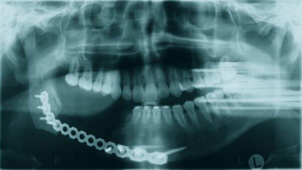 Auf der Basis der Diagnose eines malignen Tumors schloss sich nach abgeschlossenem Tumor-Staging (CT Kopf-Hals, PET, Rö-Thorax, Sono-Abdomen) die primäre Tumorresektion in Form einer Unterkieferkontinuitätsresektion (Abbildungen 4 und 5) sowie die supraomohyoidale Lymphknotenausräumung rechts an. Der entstandene Unterkieferdefekt wurde mit einer Titan-Rekonstruktionsplatte temporär überbrückt (Abbildung 6). Nach zwischenzeitlicher Nachresektion aufgrund eines tumorpositiven knöchernen Resektatrandes, wurde seitens der Pathologie die Entfernung des Tumors im Gesunden bestätigt und der Patient einer postoperativen Polychemotherapie entsprechend den Leitlinien für Osteosarkome zugeführt [www.awmf-leitlinien.de].