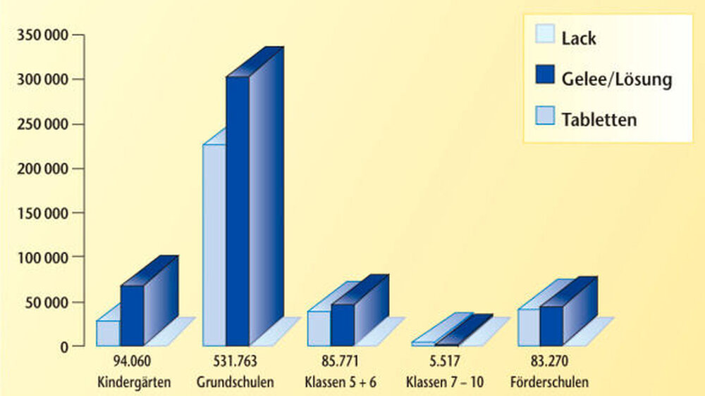 Fluoride in unterschiedlichen Formen (Lack, Gelee, Lösung oder Tablette) erhielten etwa 94 000 Kinder in Kindergärten, 532 000 Kinder in Grundschulen, 86 000 Jugendliche in den weiterführenden Klassen 5 und 6 sowie über 5 500 Jugendliche in den Klassen 7 bis 10 und 83 000 in Förderschulen – zusammen genommen etwa 800 000 Kinder und Jugendliche. Mit den Fluoridierungsmaßnahmen wurden 3,6 Prozent der Kinder in den Kindergärten sowie 21 Prozent der Kinder und Jugendlichen in den Förderschulen erreicht.