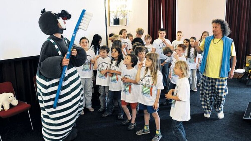 Zum Ende der Veranstaltung verlieh Sanitätsrat Stein Sanitätsrat Dr. Herbert Frank die Verdienstmedaille der LAGZ RLP für sein außergewöhnliches Engagement in der Jugendzahnpflege. Frank hatte durch seine Verbindungen zu Vertragspartnern auf Landesebene maßgeblich zur erfolgreichen Gründung der LAGZ RLP beigetragen. Unterhaltsam präsentierte die Familienklasse der Martinusschule Mainz zum Ende der Veranstaltung mit einer Gesangseinlage die Premiere eines „Max-Schrubbel Songs“ unter der Moderation von Clown „Mausini“, der mit seiner erfrischenden Art durch die Veranstaltung führte.