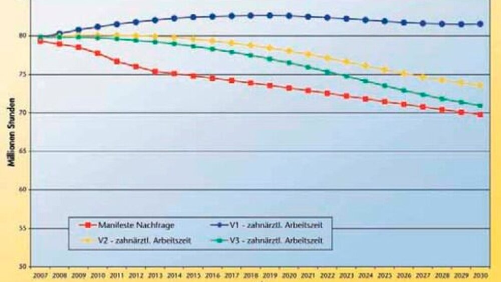 Änderungen sind laut Prognosemodell PROG30 auch bei zahnärztlichen Behandlungszeiten zu erwarten (siehe Grafik). Insgesamt ist mit einem Sinken der Nachfrage sowohl wegen des verbesserten Mundgesundheitszustands als auch wegen der sinkenden Bevölkerungszahl zu rechnen.