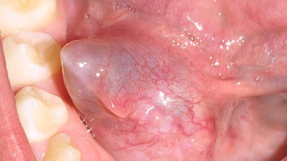 Im vorliegenden Fall wurde die vaskuläre Läsion mit einer Ranula verwechselt. Das klinische Erscheinungsbild beider Entitäten weist tatsächlich einige Ähnlichkeiten auf. Abbildung 6 zeigt die typische Klinik einer Ranula, die ebenfalls als bläulich durchscheinende Läsion im Mundboden erkennbar wird. Allerdings ist die Ranula als geschlossene Extravasations-Pseudozyste der Speicheldrüsen prall und nicht, wie die Gefäßmalformation, leicht ausdrückbar.