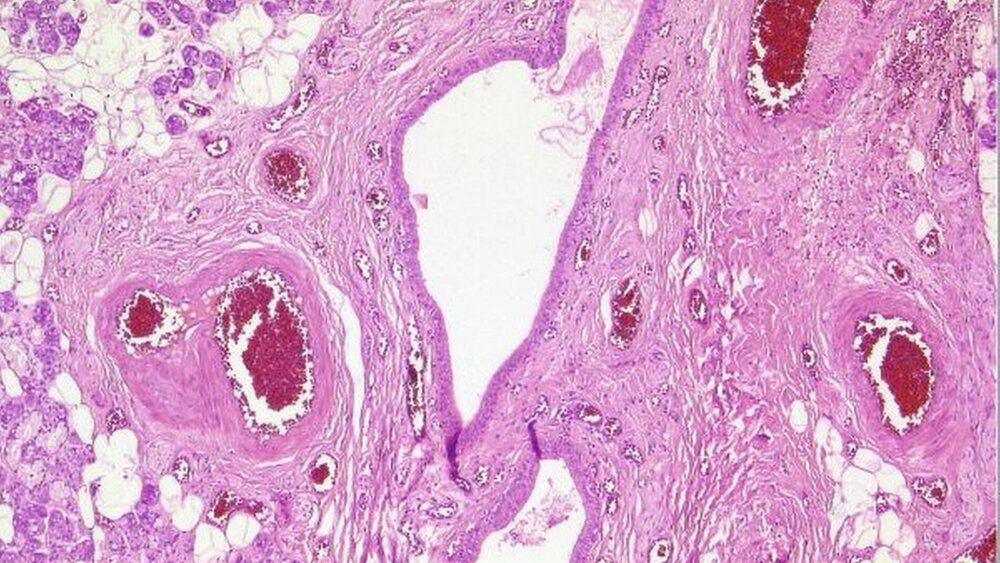 Therapeutisch erfolgte die Exstirpation des Tumors gemeinsam mit der Glandula submandibularis. Es stellte sich, entsprechend der Bildgebung, ein gut begrenzter solider Tumor dar. Histologisch zeigte sich ein inhomogener Tumor mit epithelialen Anteilen, die solide, teils tubulär adenoide Strukturen formen. Daneben auch Areale mit myxoider Differenzierung und Zellnestern mit Schleimbildung (Abbildung 4). Durch eine starke fibröse Kapsel abgegrenzt, stellen sich neben dem Tumor Anteile einer gemischten, überwiegend serösen Speicheldrüse dar.