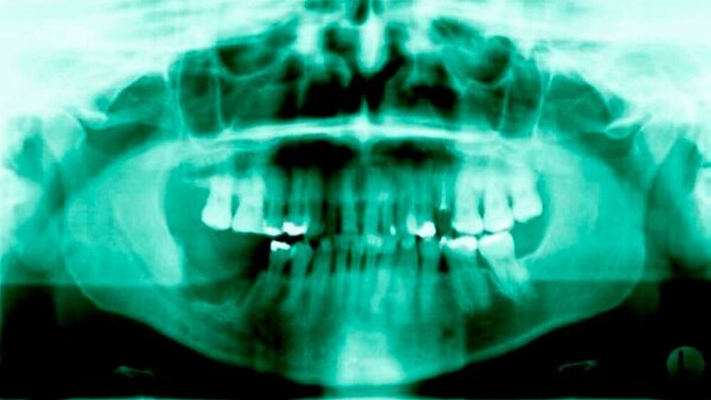 Die Zähne 46 und 47 erwiesen sich als asensibel. Die radiologische Untersuchung (Orthopantomogramm (siehe Abbildung 1b) und digitale Volumentomographie) zeigten gemischt radioluzente und radioopake Areale in regio 46/47 in unmittelbarer Nähe des Canalis mandibulae rechts.