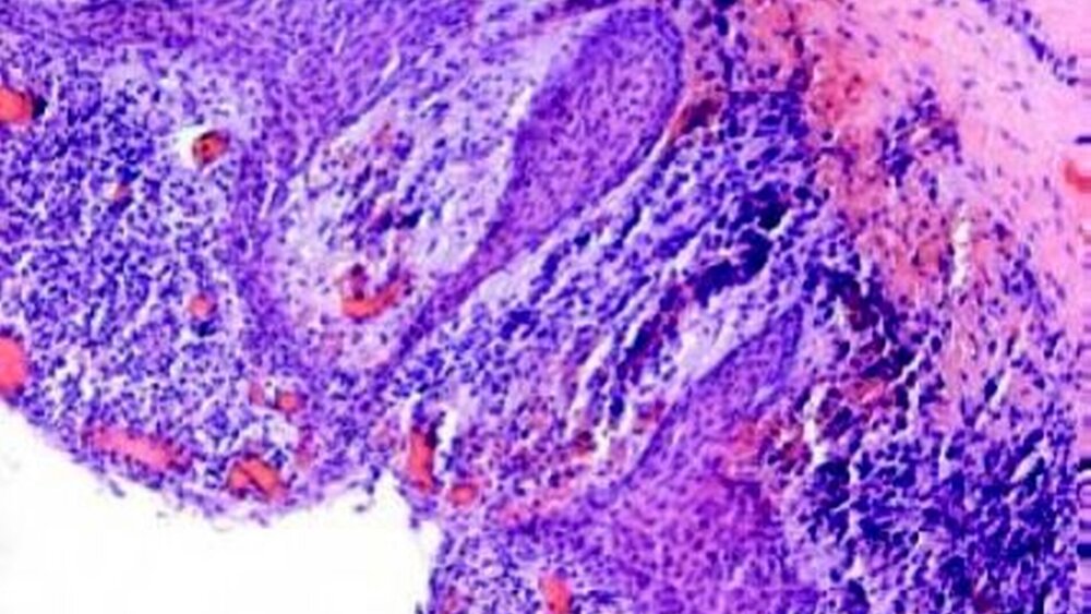 Die histopathologische Begutachtung der Präparate ergab ausgedehnte radikuläre Zysten (Abbildung 5). Bei der radiologischen Kontrolle nach einem halben Jahr zeigten sich die Radioluzenzen deutlich rückläufig, klinisch fanden sich unauffällige Verhältnisse.