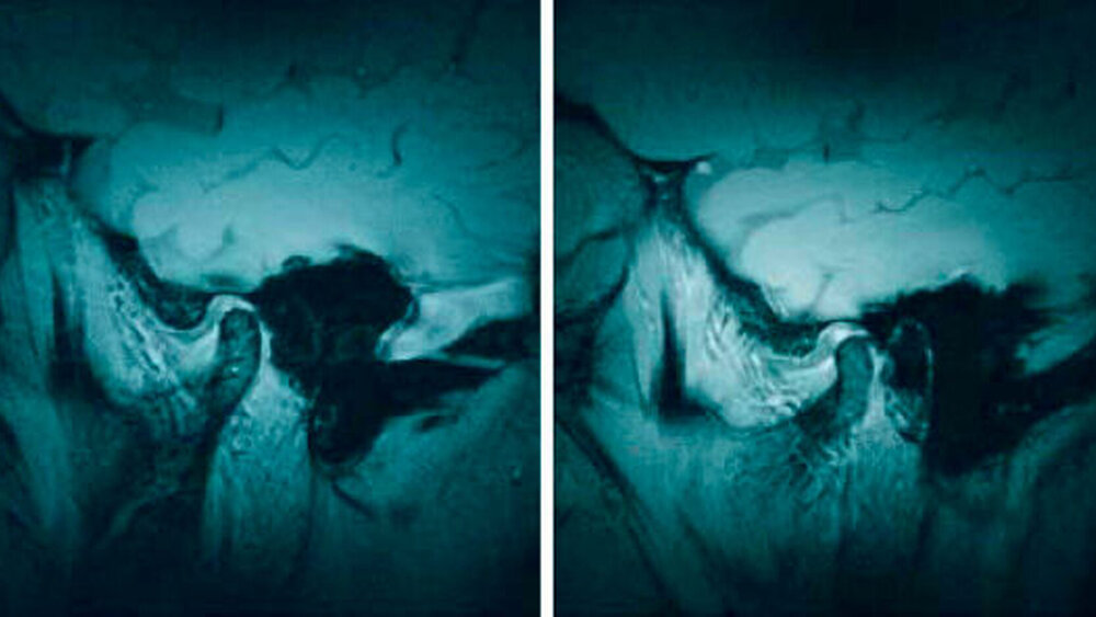 Der Röntgenstatus zeigte eine insuffiziente Wurzelkanalbehandlung an 37 mit apikaler Aufhellung. Sowohl im Ober- als auch im Unterkiefer waren Verschattungen im Sinne metallischer Restaurationen zu erkennen (Abbildung 3). Da bei der vorliegenden muskulären Problematik (myofascialer Schmerz) die Kiefergelenkdiagnose deutlich erschwert sein kann [Schmitter et al., 2006], wurden magnetresonanztomographische Bilder (PD-gewichtete Sequenzen) bei geöffnetem und geschlossenem Kiefer in sagittaler und coronaler Schnittführung angefertigt. Dies erschien notwendig, um eine valide Kiefergelenksdiagnose zu erzielen [Schmitter et al., 2006]. Der Hinterrand des Diskus articularis ist beidseits in der sagittalen Schichtführung bei circa 10 Uhr (Abbildung 4a), wobei der Hinterrand des Diskus noch zwischen dem Condylus und dem Tuberculum articulare zu liegen kommt.