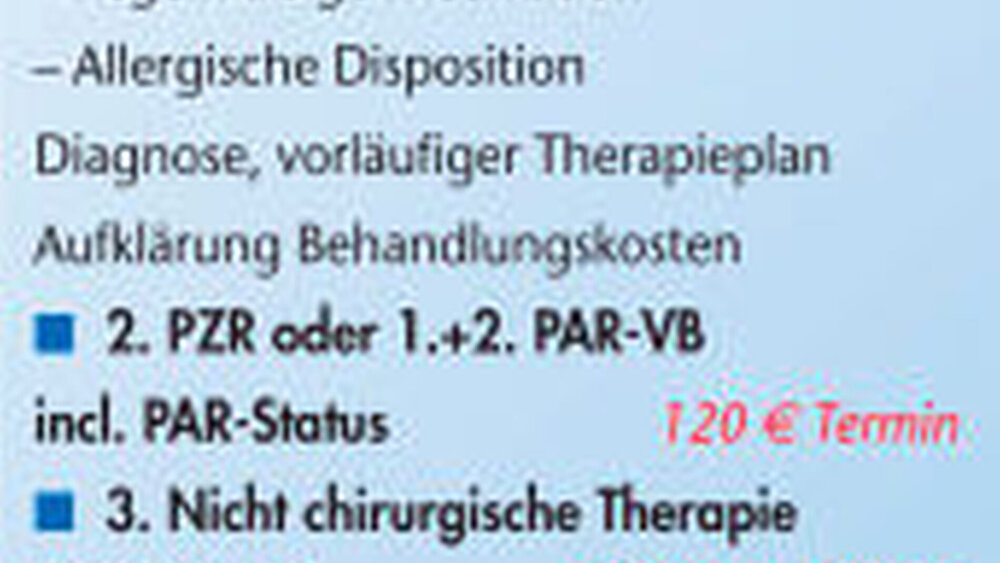 Die parodontale Initialtherapie ist immer Privatleistung. Im Gegensatz zur reinen Prophylaxe (PZR) ist die Initialtherapie bei Parodontalpatienten medizinisch orientiert, umfasst den supra- und subgingivalen Bereich und ist daher teurer. Neben der Mundhygieneinstruktion und der Verminderung der Keimbelastung beinhaltet sie alle aus ärztlicher Sicht bekannten Risikofaktoren: Parodontitis-Stopp-Programm.