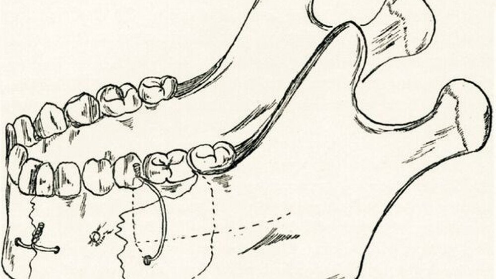 Neben dieser konservativen Form der Frakturversorgung entwickelte sich die chirurgische Versorgung durch Drahtnähte (Abbildung 10), die Anlage eines Fixateur externe und schließlich eine osteosynthetische Versorgung, vergleichbar mit der heute üblichen Plattenosteosynthese. Diese zunächst an Extremitätenfrakturen angewandte Technik (Carl Hansmann, 1852–1917) wurde erstmalig im Ersten Weltkrieg bei der Versorgung einer nicht abheilenden Fraktur der Unterkieferfront mittels aus einem gespendetem Trauring hergestellten Goldband und einer Goldschraube angewandt [4]. Aus diesen Anfängen heraus entwickelten sich die heute bekannten Plattensysteme. Durch den Einsatz von Antibiotika sank die Komplikationsrate deutlich, so dass die Frakturversorgung heutzutage in der Regel keine Probleme mehr bereitet.