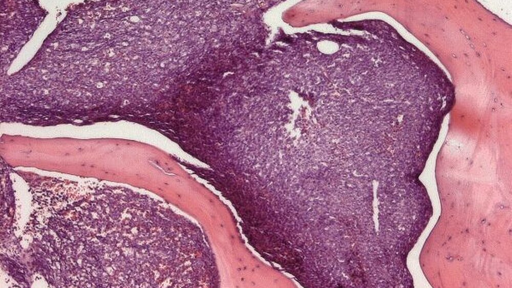 Bei Verdacht auf ein leukämisches Infiltrat wurden eine Probeexcision der Gingiva durchgeführt und ein Differentialblutbild angefertigt. Das Auftreten von Blasten sowie ein massiv erhöhter Anteil an Monozyten im Differentialblutbild (Tabelle 1) deuteten in Kombination mit dem klinischen Erscheinungsbild und der Histologie (Abbildung 5) auf eine akute myeloische Leukämie vom monozytären Typ (M5) hin. Die Patientin wurde nun den Kollegen der Hämatologie/Onkologie zur Knochenmarksbiopsie (Abbildung 6) und Weiterbehandlung vorgestellt. Drei Tage später wurde eine Chemotherapie mit Daunorubicin, Cytarabin und Midostaurin eingeleitet.