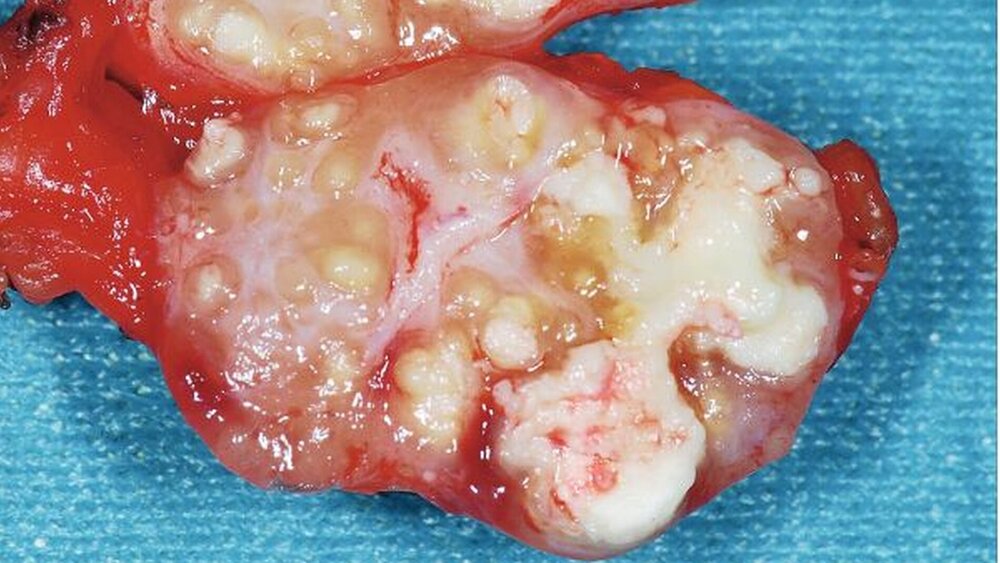 Unter dieser Therapie bildete sich die kutane Läsion deutlich zurück, so dass die Diagnose der Mykobakteriose ex juvantibus als gesichert gelten kann. Allerdings persistierte der größte der submandibulären Lymphknoten. In der Folge wurde dieser Lymphknoten selektiv exstirpiert. Die intraoperative Morphologie (Abbildung 4) war dabei erneut charakteristisch für eine atypische Mykobakteriose, und es ergab sich histologisch eine epitheloidzellig-granulomatöse und floride nekrotisierende Lymphadenitis.