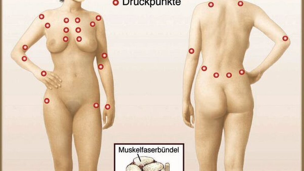 Ein ebenfalls ernstzunehmendes Krankheitsbild, das aber oft als Verlegenheitsdiagnose angegeben wird, ist die Fibromyalgie. Die Störung ist charakterisiert durch nicht entzündliche, diffuse chronische Schmerzen, die meist von weiteren Beschwerden begleitet sind. Hierzu gehören Schlafstörungen, Müdigkeit und regelrechte Erschöpfungszustände und eine gewisse Steifheit der Glieder, die vor allem in den Morgenstunden besteht. Die Fibromyalgie wird oft dem sogenannten Weichteilrheumatismus zugeordnet, wenngleich keine entzündlichen Veränderungen bestehen. Viele Patienten geben zugleich vegetative Beschwerden an. Deren Palette ist fast unübersehbar groß und reicht von Herzklopfen über Atembeschwerden bis zum Haarausfall, einer erhöhten Infektanfälligkeit, Taubheitsgefühlen, Zahnschmerzen und einem Kloßgefühl im Hals. Auch ein Tinnitus kann auftreten, vermehrtes Schwitzen, Stimmungsschwankungen und sogar eine depressive Verstimmung. Die Schmerzen treten in wechselnden Körperregionen auf, ohne dass jedoch Organ- oder Gewebeschäden nachweisbar sind.
