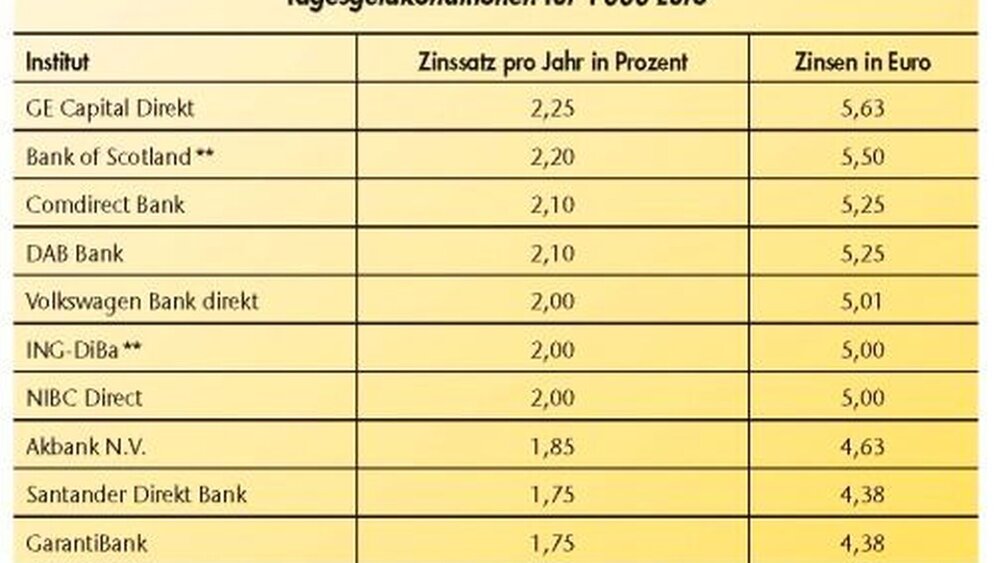 Ebenfalls ohne Nebenkosten führen die Geldinstitute Tages- und Festgeldkonten. Auf ihnen parken die privaten Anleger ihre Spargroschen am liebsten. Zwar locken auch hier keine besonders attraktiven Konditionen. Doch lässt sich das Geld kurzfristig parken und für bessere Gelegenheiten wieder abheben. Tagesgeld steht sogar jederzeit zur Verfügung. Dabei lohnt sich ein Blick auf die Tabelle. Die besten Konditionen bietet zurzeit die GE Capital Direkt mit einem Zinssatz von 2,25 Prozent pro Jahr. Die zum amerikanischen Konzern General Electric gehörende Bank ist am Einlagensicherungsfonds der privaten Banken beteiligt und seit Mitte Juli in Deutschland auf Kundenfang. Ihr folgt die britische Bank of Scotland mit 2,20 Prozent und die Comdirect Bank mit 2,10 Prozent. Die Liste beim Festgeld führt die estnische Big Bank AS an. Sie bietet für 10 000 Euro Anlagebetrag, ein Jahr fest, 2,50 Prozent, die niederländische NIBC Direct folgt mit 2,40 Prozent. Mit diesen Angeboten sind Sparer gut bedient. Es bleibt ihnen jedenfalls nach Abzug der Inflationsrate und Steuern noch ein Gewinn.